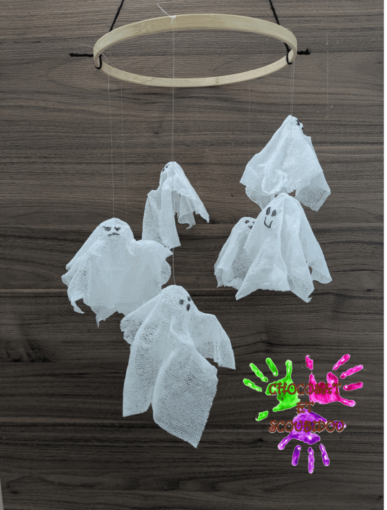 - Assembler : passer un fil de nylon avec une aiguille au sommet de chaque fantôme, faire un nœud et accrocher au support choisi. Avec un anneau de broderie, vous obtiendrez un joli mobile fantomatique.