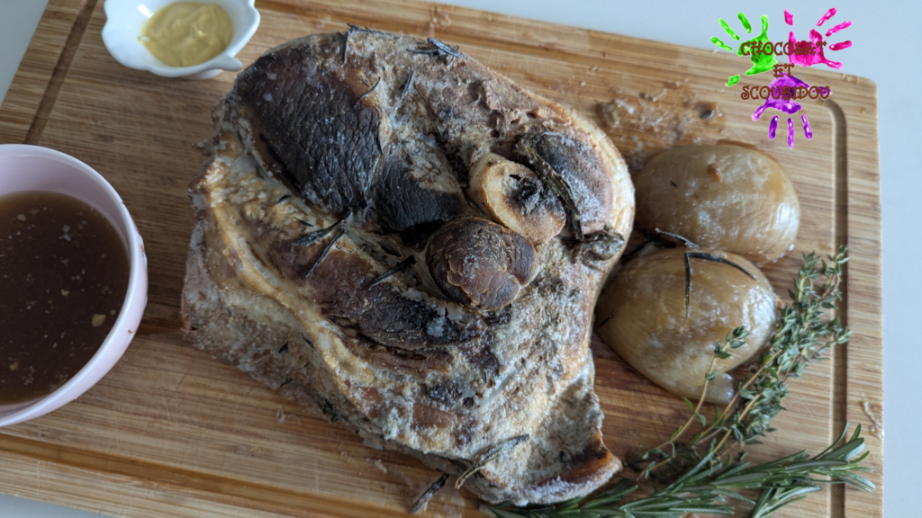 - Enfourner et cuire pendant environ 4 h 30, jusqu’à ce que la viande soit très tendre et que l’os se détache facilement.